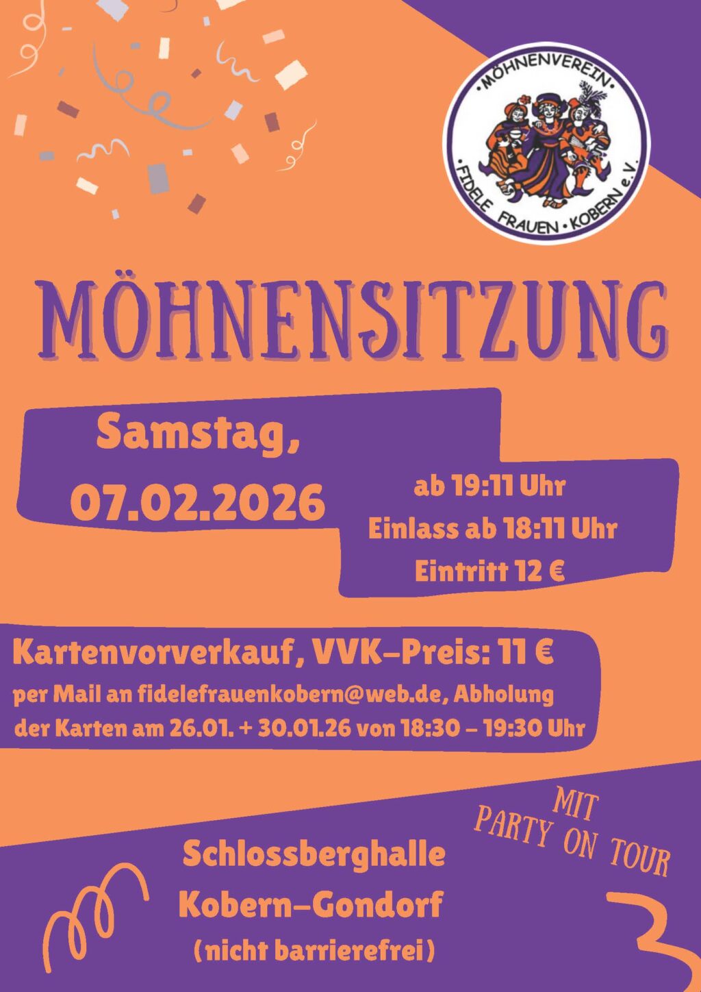 Samstag 07.02.2026 ab 19:11 Uhr – Einlass 18:11 Uhr Eintritt an der Abendkasse 12 € Schlossberghalle Kobern-Gondorf (nicht barrierefrei) Kartenvorverkauf, VVK-Preis: 11 € per Mail