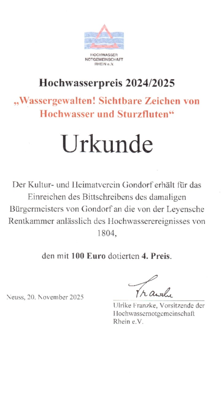 Der Kultur- und Heimatverein Gondorf wurde mit dem 4. Platz des Hochwasserpreises ausgezeichnet und erhielt ein Preisgeld von 100 Euro. Die Preisverleihung fand am 20.