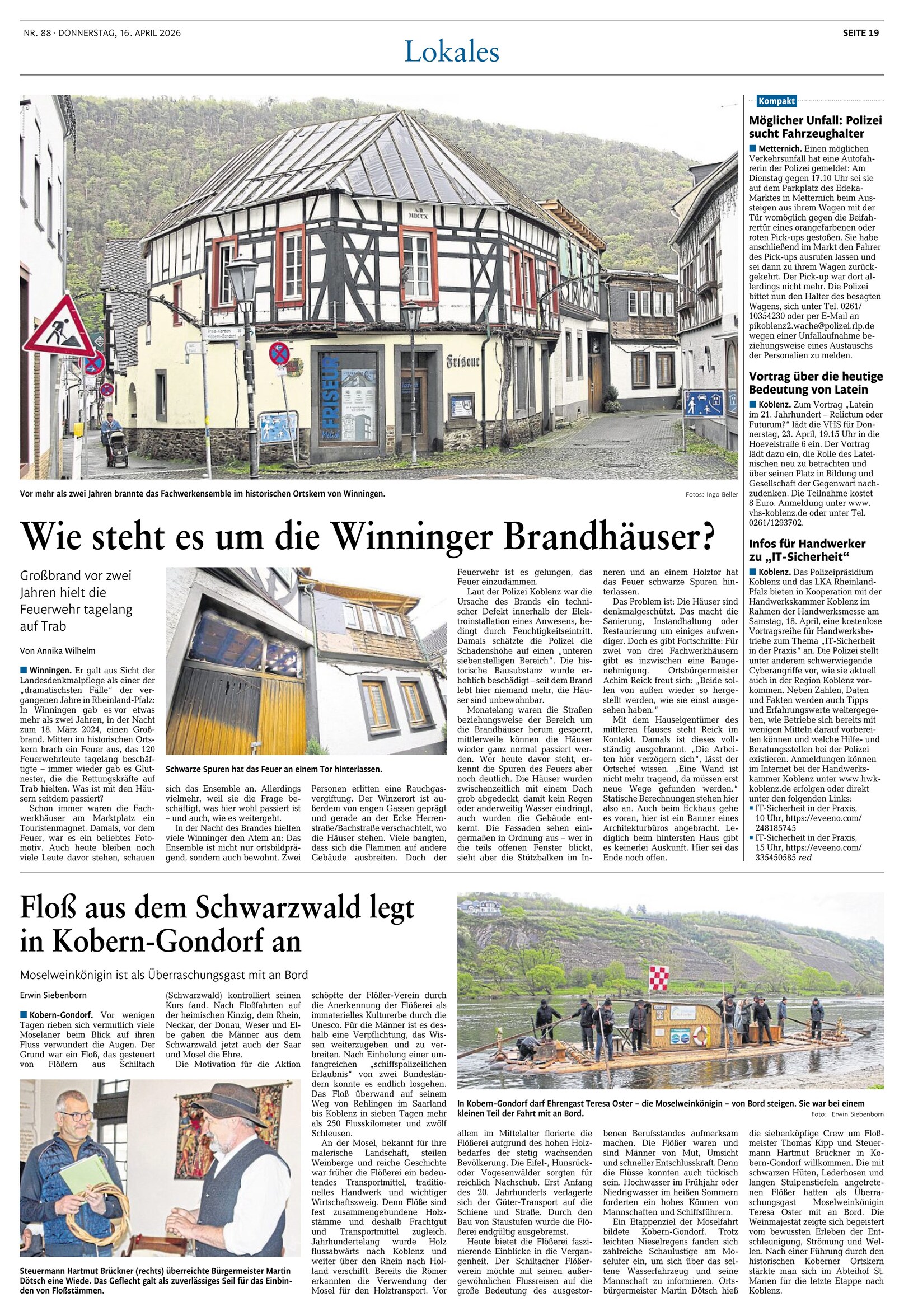 Der Verein Schiltacher Flößer e.V. wird am Montag, den 13.04.2026, im Rahmen seiner Floßtour auf der Mosel einen Halt in Kobern-Gondorf einlegen. In Brodenbach nehmen sie die Moselweinkönigin Teresa Oster und den Koberner Nachtwächter und seine Marketenderin an Bord und passieren anschließend die Schleuse in Lehmen. Gegen etwa 11:00 Uhr wird das Floß Kobern-Gondorf erreichen.