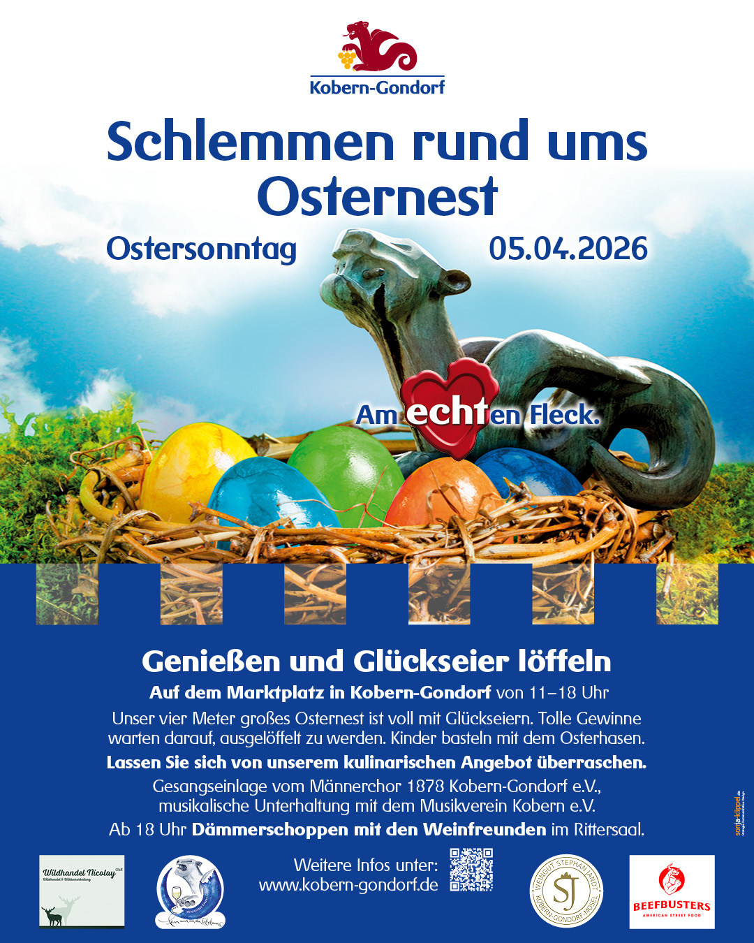 Am Ostersonntag, 05. April 2026, lädt Kobern-Gondorf an der sonnigen Untermosel rund um eines der größten Osternester der Welt zur kulinarischen Veranstaltung „Schlemmen rund ums Osternest“ ein.