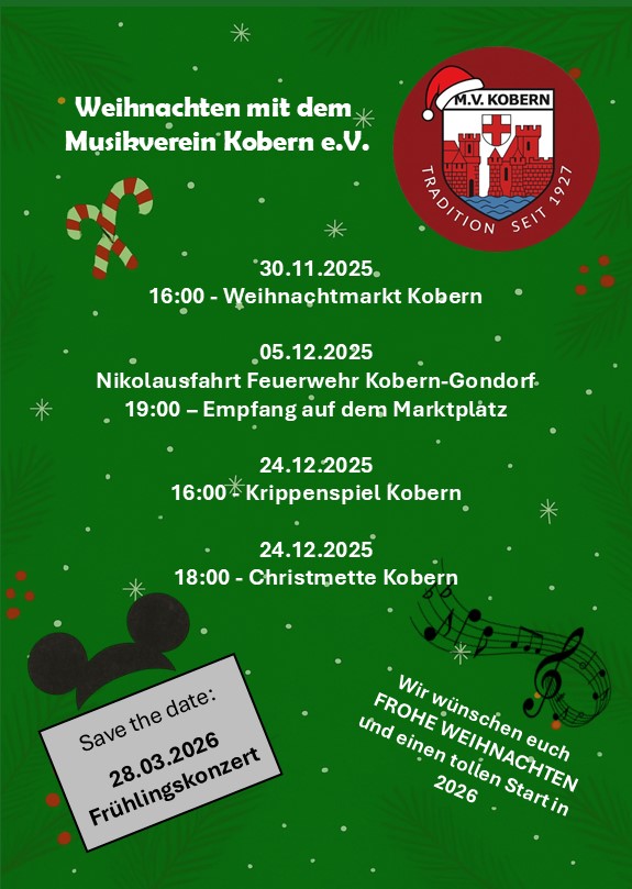 Der Musikverein Kobern e.V. steht für anspruchsvolle Blasmusik, kreatives Konzerte und lebendige musikalische Gemeinschaft. Mit einem engagierten Hauptorchester und einer aktiven Nachwuchsarbeit vereint der Verein generationsübergreifend Menschen, die Freude an Musik teilen.